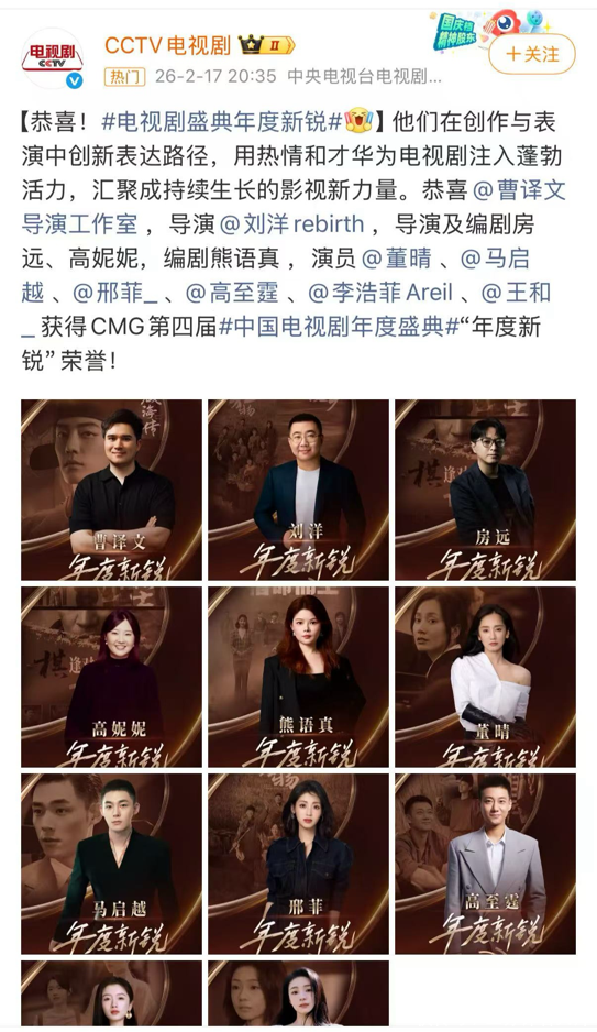 年度新锐荣誉颁给了在创作与表演中展现创新表达、为行业注入蓬勃活力的青年影视人。这一名单由央视官方平台CCTV电视剧微博在当晚公布,迅速引发行业关注。熊语真作为编剧代表入选,意味着她的原创能力和专业突破得到了国家级平台的认可。对于入行多年、一直埋头创作的熊语真来说,这份认可来得并不突然,却也分量十足。