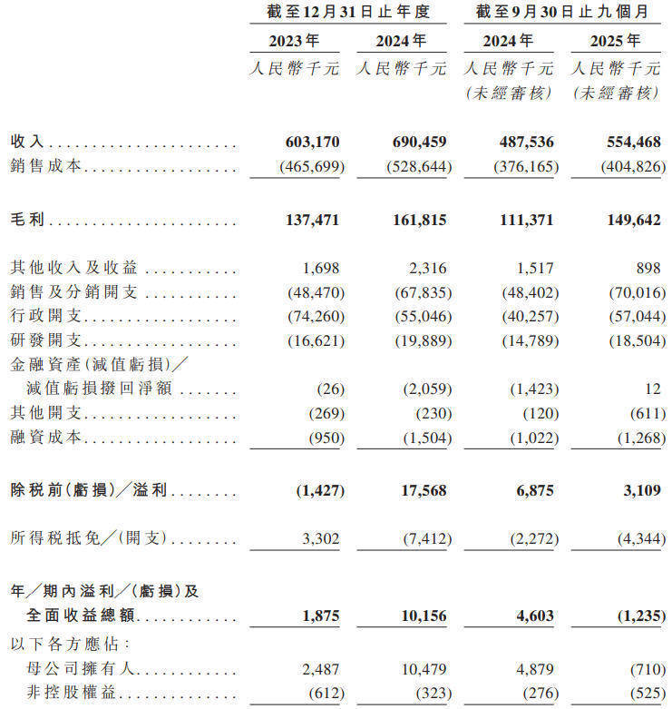 2025年前9个月,公司营收为5.54亿元,毛利为1.5亿元,期内亏损为123.5万元。