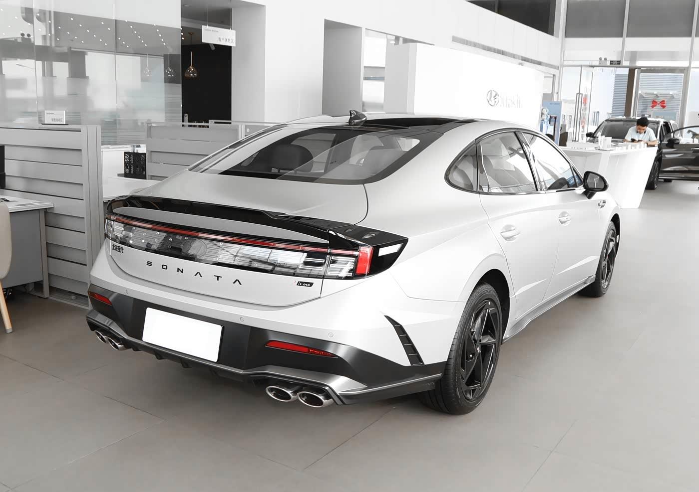 再来看车尾部分,车尾设计以H型贯穿灯组为核心,搭配小鸭尾扰流板,形成“流动光轨”的视觉效果。 尾灯内部采用LED光源,夜间点亮时辨识度极高。排气管布局为双边双出式,圆形设计简洁而不失力量感。 后保险杠线条硬朗,与车头风格呼应,同时通过多层次曲线营造出饱满的立体感。 整体尾部造型既满足空气动力学需求,又强化了车辆的运动属性。