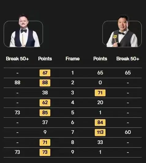 从技术统计来看,墨菲全场打出三杆50+(88、73、73),张安达则有两杆50+(65、60)入账。尽管双方在进攻火力上差距不大,但墨菲在关键分上的把握和攻防转换的效率上更占优势。张安达在比赛中多次展现出不俗的进攻能力,但在局面控制和防守细腻度上与墨菲存在一定差距,尤其是在比分落后时,急于追分的心态导致失误增多,未能实现逆转。